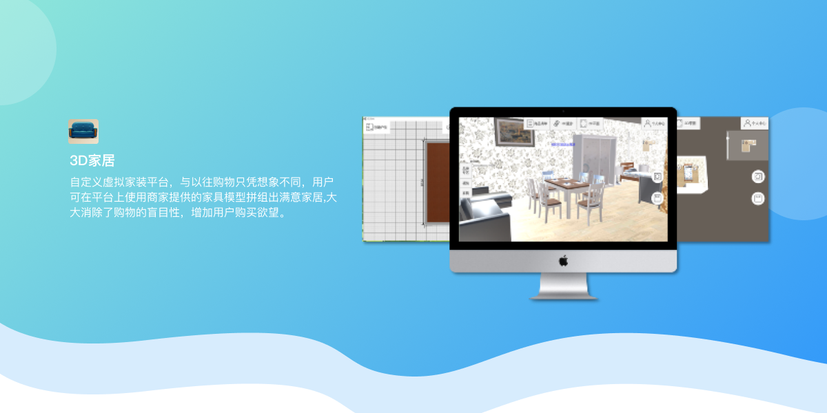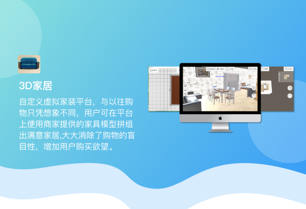 自定义虚拟家装平台,与以往购物只凭想象不同,用户可在平台上使用商家提供的家具模型拼组出满意家居,大大消除了购物的盲目性,增加用户购买欲望。