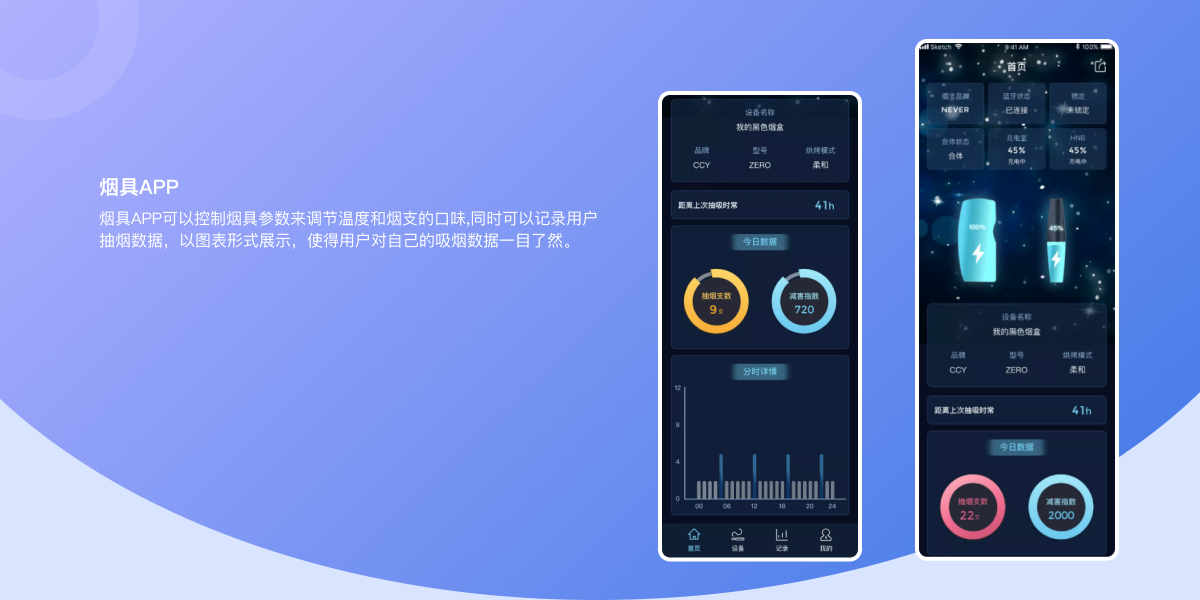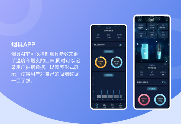 烟具APP可以控制烟具参数来调节温度和烟支的口味,同时可以记 录用户抽烟数据,以图表形式展 示,使得用户对自己的吸烟数据 一目了然。