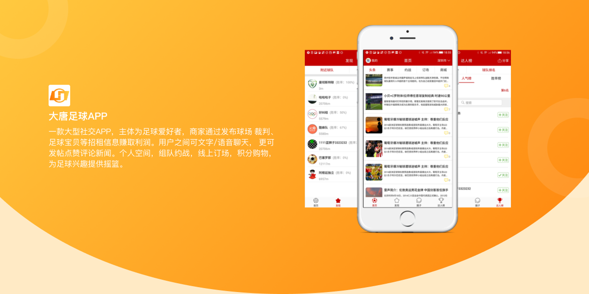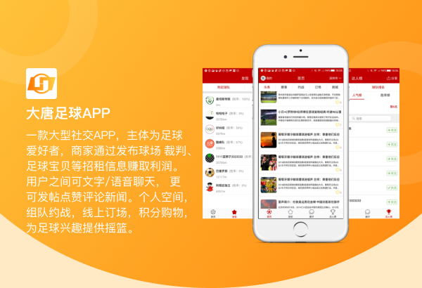 一款大型社交APP,主体为足球爱好者,商家通过发布球场 裁判、足球宝贝等招租信息赚取利润。用户之间可文字/语音聊天, 更可发帖点赞评论新闻。个人空间,组队约战,线上订场,积分购物,为足球兴趣提供摇篮。